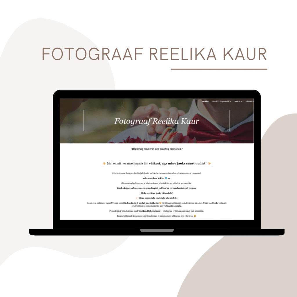 Valminud sai isiklik fotograafia koduleht Google Pages platvormil, eesmärgiga tõsta nähtavust ja esitleda portfooliot. Lehele lisasin kogu vajaliku info teenuste, tööde ja portfoolio kohta, tagades selge ja ülevaatliku esitluse.